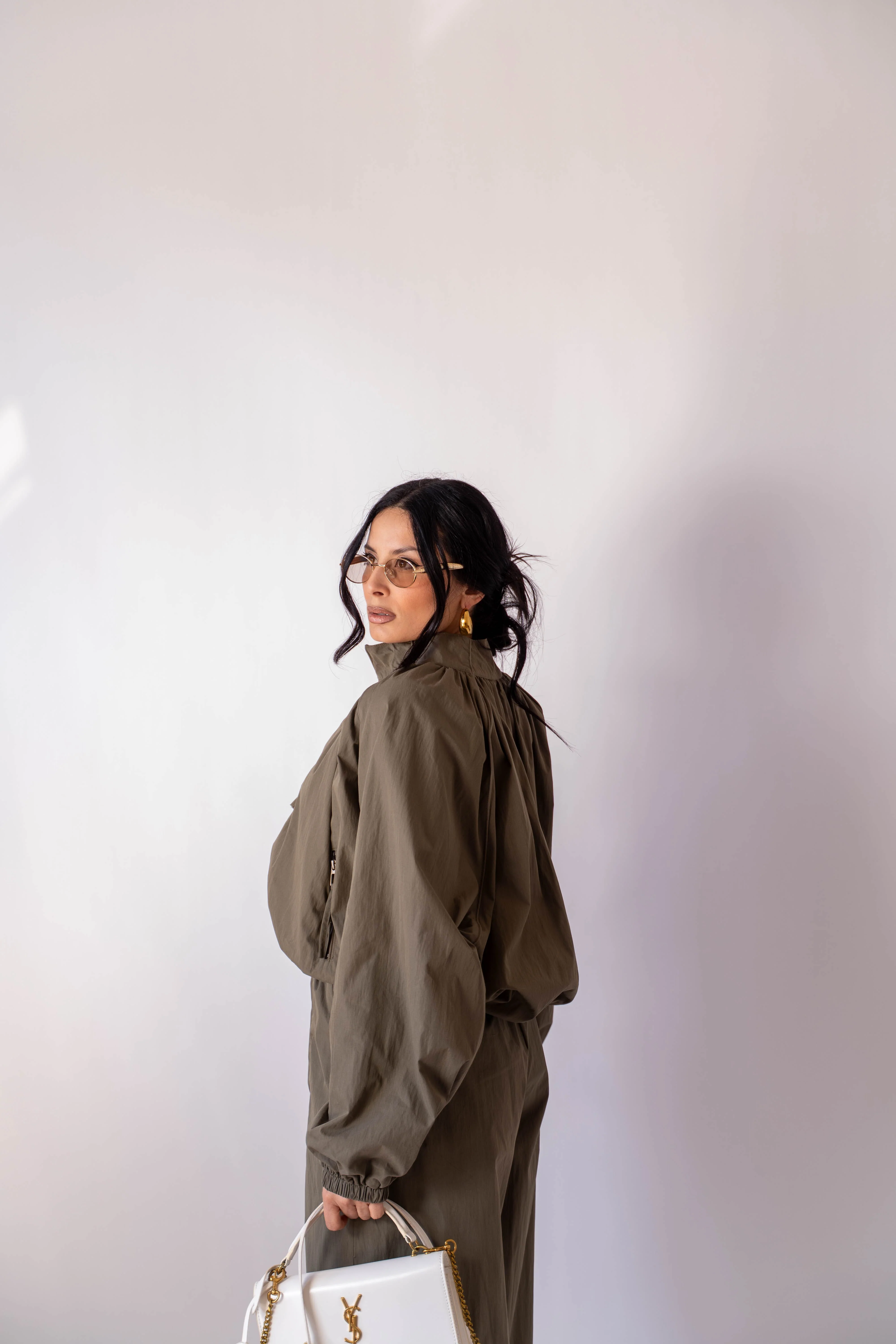 Pantalone con elastico in vita, giubbotto con elastico in vita.